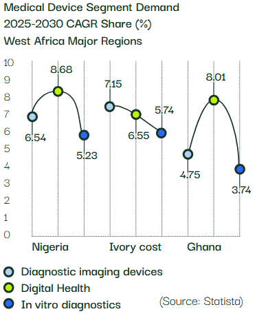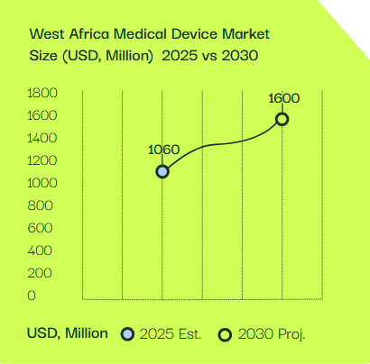 Empowering West Africa forms a vital segment of Africa’s fast-growing medical device industry and is expanding steadily across diagnostics, imaging, patient monitoring and cold-chain capacity for immunisation. Private sector participation and donor-funded health programmes continue to drive stable procurement flows. Regulatory improvements, particularly those led by NAFDAC, are enhancing product quality and investor confidence, while regional harmonisation efforts further strengthen market alignment and compliance. The region’s medical device market is forecast to grow from USD 1,060 million in 2025 to USD 1,600 million by 2030, registering a CAGR of 8.56% (Source: Statista), signalling sustained expansion. This growth is driven by hospital modernisation efforts, increasing diagnostics penetration and continued investments in universal health coverage.
