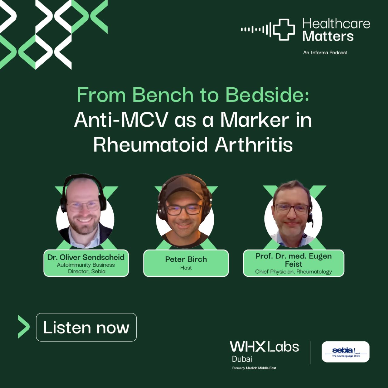 In this episode, powered by WHX Labs Dubai, formerly Medlab Middle East, in partnership with Sebia, we explore the evolving landscape of autoimmune diagnostics and innovation, with a focus on anti-MCV as a key marker for rheumatoid arthritis.
